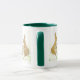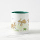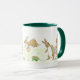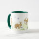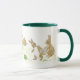 Uma caneca branca com uma alça verde escura e lábio com uma design de coelhos Páscoas escondendo Ovos de Páscoa, de um design pintado à mão por Judy Adamson.