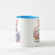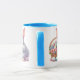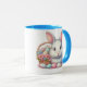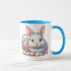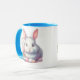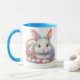 Um belo coelho branco da Páscoa está pronto com uma cesta de ovos pastéis de Páscoa e flores de primavera está pronto para se esconder na manhã da Páscoa. Esta caneca bonito está pronta para seu café ou chá de manhã de Páscoa!