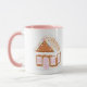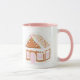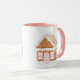 Pão de gengibre bonito pingando com gelo branco sujo e embelezamentos de doces pastel. Bonito janelas cor-de-rosa e uma porta arqueada em uma armação marrom de especiarias de canela.