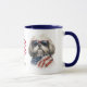 A característica desta caneca única é uma imagem aquosa de um cão Shih Tzu envolto em uma bandeira americana e vestindo óculos de sol. A imagem está em dois lados da caneca, com estrelas e listras e seu texto personalizado entre elas.