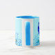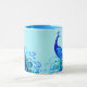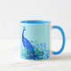 Mug em um pavão fantástico com uma cauda lavada, em tons de tartaruga profunda e azul de cobalto, em um fundo aquático macio