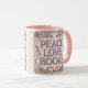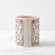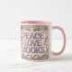 This mug features a vintage-style typographic design with the text PEACE LOVE BOOKS in lavender letters on a cream background. The mug is a ceramic book lovers mug. The text is arranged in three lines with PEACE on top, LOVE in the middle and BOOKS at the bottom. The letters have an elegant, decorative font style with serifs and flourishes. The design is framed by an ornate Art Nouveau-style border with flowing curves and ginkgo leaf patterns in a soft pink color. The border elements curve around the corners and sides of the text, creating an elegant frame. The mug is a pink and white combo mug. The mug has a pink glaze interior and a pink handle. The mug is an eleven ounce mug.