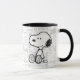 Enjoy your coffee amidst the "noise" of the funny pages! This unique Peanuts mug features a classic sketch of Snoopy sitting calmly, layered over a dynamic background pattern of comic strip sound effects and text. Phrases like "HA HA HA," "POW!", "ARF!", and "LOOK OUT!" are scattered in light grey behind the bold black Snoopy illustration, capturing the chaotic energy of the original comics. With its sleek black rim and handle, this two-tone mug adds a modern, stylish edge to the retro artwork, making it a standout piece for any collector's cabinet.