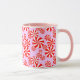 Uma caneca com um doce padrão vermelho-listrado e branco de doces pimenta-pimenta em um fundo de rosa claro.