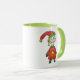 Garota pateta de desenho animado com olhos devorados, dois dentes, cabelo louro e uma cabra, vestindo um vestido vermelho com uma trilha verde e uma estrela amarela na frente. O chapéu correspondente é disparado com um ouro, um sino. Arte de desenho original de Taylor Addams. Cartunista. Mensch.