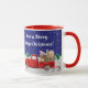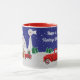 Pequeno Caminhão Vermelho e Uma Caneca Branca Antica. Apresentando o trabalho de arte original do Rick "Pequeno Caminhão Vermelho" de Ellinger. Texto: Tenham Natais vintages de Feliz! A coleção de antiguidades inclui um velho trator vermelho. Presente perfeito para o colecionador de caminhões vermelhos ou negociante ou colecionador antigo na sua lista de presentes.