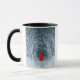 Pequeno Chapeuzinho Vermelho em um inverno nevado caminha pela floresta. Conseguem ver o Lobo Mau a uivar à distância? Uma versão granulada de uma pintura de aquarela negativa.