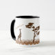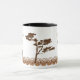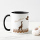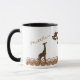 Esta caneca personalizada caracteriza duas silhuetas do girafa do marrom escuro que enfrentam uma silhueta de uma árvore da acácia no centro da caneca. Uma tira do estilo das pastagem do marrom e as lâminas de grama tan limitam a parte inferior da caneca. Acima de cada animal, há uma área do modelo para que você adicione seu nome ou o outro texto feito sob encomenda em ambos os lados da caneca.