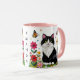 A sweet personalized coffee cup with a cute illustration of a black and white cat surrounded by flowers and butterflies in a paper quilling impasto style.