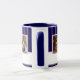 Personalized Family 3 Photo Collage Christmas Mug. Merry Christmas and a custom text. Add three photos. Personalize the text any way you wish or delete it. The background features a blue background with white stripes. Great as a Christmas gift or a keepsake mug for yourself.