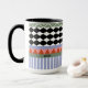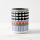 ☕ Enjoy a cozy moment with this personalized geometric abstract name mug. 🌿 Features sage green and white bands and lilac white stripes and triangles, accented with black and white wavy patterns and subtle vertical stripes for a charming, balanced look.