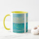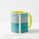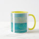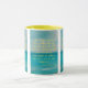 Esta caneca de duas tonalidades apresenta uma impressão de harmônica bronca com letras amarelas mostrando o verso da bíblia "Philippians 1:6 KJV" sobre uma imagem de fundo mostrando uma vista do oceano com água azul agradável do litoral sob um céu parcialmente nublado. Este verso está referindo o capítulo do Livro de Philippians 1rua mostrando o verso 6 neste tema de citação da bíblia do Rei James bíblia. A jante e o manípulo são vidrados em cores compatíveis, disponíveis em micro-ondas e máquinas de lavar louça de tamanho 11 onças ou 15 onças, construindo cerâmica segura.