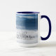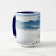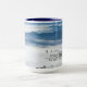 Escritura cristã de citações da caneca de café retrata uma fotografia natural com montanhas azuis cobertas por uma nuvem embaçada. Ele apresenta a Bíblia Verse Philippians 4:13, "Eu posso fazer todas as coisas através do Cristo que me fortalece."