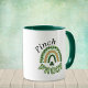 This coffee mug features the text "Pinch Proof" and a cool St Patrick's Day rainbow in various shades of green, including plaid, and gold. A small shamrock is underneath the rainbow. This cup will help remind people you aren't pinchable on Saint Paddy's Day but can be fun and festive any day. The default choice has a green handle and green inside, but a budget version is available with a plain handle and inside.