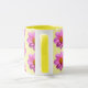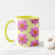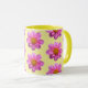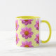 Um padrão de dahlias cor-de-rosa num fundo amarelo. Mesmo que as flores não estejam florescendo no jardim, elas estão quando você procura esta caneca. Pense em Summer quando você tomar seu café ou chá.