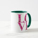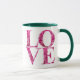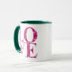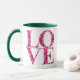 The floral coffee mug features the word "LOVE" in a floral lettering extracted from a macro photo of a spring blooming pink hydrangea.