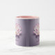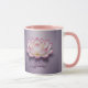 This mug features a digital illustration of a lotus flower centered on a metallic lavender gradient background. The lotus has pink and white petals with subtle striations and gradients, creating a soft, ethereal appearance. The petals are arranged in a perfect circular pattern, with the outer petals in a pink shade transitioning to lighter, almost white inner petals. The center of the lotus contains golden-yellow stamens. Below the lotus flower, the word Lotus is written in script in a light pink color with a metallic sheen. The mug is a pink and white combo mug. The mug has a pink glaze interior and a pink handle. The mug is an eleven ounce mug.