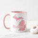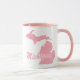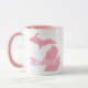 Mostre seu orgulho de casa com essas t-shirts e outros itens que têm um contorno rosa do estado de Michigan com o nome dentro da forma.