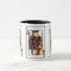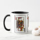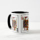 Um design único derretendo o casal de força de Pinochle, o Valete dos Diamantes e a Rainha dos Espadas em uma única carta de jogo. As alças e interiores de cada caneca combinam e elas vêm em duas cores diferentes também, o que permite uma maneira excelente de distingui-las em uma festa de cartas. Uma combinação de cores diferente para cada jogador. A caneca é perfeita para qualquer um que joga pinochle ou como presente.
