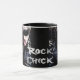 Branco e preto 11 oz. combo caneca com uma imagem, de ambos os lados, de um pintinho rochoso e o termo facultativo "Pintinho rochoso" em letra prateada a preto. Ver frasco correspondente e placa de papel. Veja toda a coleção de Mug Tubular 80s na COMIDA/BEV | Seção pratos.
