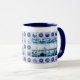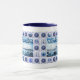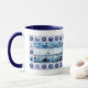 Do Dutch idoso de Holland do vintage o estilo azul do Delftware-olhar de Delft telha a caneca mural. A opinião do vintage do azulejo azul do estilo de Delft na caneca de café mural Delftware do Dutch de Amsterdão Holland com uma vista marítima do século XVIII velha de navios de troca na cidade de Amsterdão e de azulejos com imagens de um homem do guarda-chuva em um dia chuvoso e ventoso nos moinhos de vento, ponte magro de Amsterdão, calçados de madeira holandeses, bitterballen, moinho de vento holandês, azulejos do compasso e uma navigação do barco.