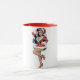 A glamorous, gorgeous pinup-style cartoon woman embodying the spirit of Santa, striking a confident pose against a blank background. She is wearing a festive red and white Santa outfit featuring a deep v-neck. Her high heels add an alluring height, while her long, sleek hair cascades down in waves, reflecting a playful sheen. Fishnet stockings gracefully adorn her legs. Vibrant and cheeky, pinup aesthetic.