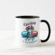 Um design de caneca estilo pixel-art com uma cápsula ou pílula aberta, da qual emerge uma bicicleta. O trabalho de arte apresenta cores vibrantes e contrastantes, dando ao design um sentimento vivo e energético.