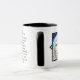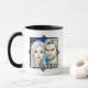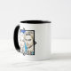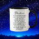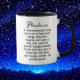 Arte AI retratando uma raça terrestre extra alienígena Pleiadiana masculina e feminina com um fundo de OVNI estrelado. Enumerados no verso da caneca de café estão os traços e características de um Pleiadiano.