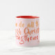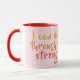 Uma caneca de café rosa-cristã com texto do livro dos Philippians, "Eu posso fazer tudo através de Cristo que me fortalece". A redação está em tons de laranja e vermelho impresso sobre rosa pálido. Vermelho é a cor do sotaque na alça e dentro na xícara - ou troque-a. Faz um belo presente para a mulher cristã.