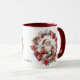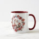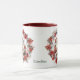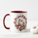 Nessa bonito caneca Holiday, o Papai Noel está vestido com seu terno e boné vermelho tradicional, revestido de pele, e tem uma planta de poinsettia cercada. O retrato está contido dentro de uma coroa vermelha do círculo de poinsettia. A imagem é impressa duas vezes na caneca, com seu nome ou outro texto em verde na parte inferior central.