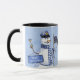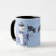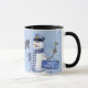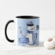Esta caneca de café de férias para policiais mostra um boneco de neve pintado artisticamente vestindo um boné policial e segurando uma fina linha azul bandeira americana com estrelas e listras e segurando uma placa que diz "Feliz Natal". Concebido pelo artista mundialmente famoso ©Tim Coffey.