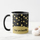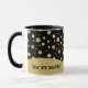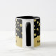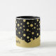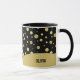 Uma caneca para a moda, esta design apresenta um padrão de bolinhas dourada sobre um fundo preto contrastante. Basta editar o texto de exemplo com o seu texto ou nome no outro lado.