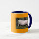 Foto bonito de um porco do potbelly do bebê na caneca azul e branca alaranjada. Aperfeiçoe para amantes do café!