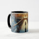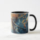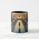 Um trabalho de arte de fantasia impressionante de ficção científica retratando um ser celestial majestoso com asas radiantes descendo de um portal divino de luz. A cena é repleta de intrincada arquitetura, símbolos flutuantes e pombas voadoras, fundindo elementos futuristas e angélicos numa paisagem surreal de sonho. Um design perfeito para uma caneca que inspira imaginação e maravilha com cada gole!