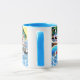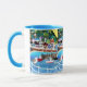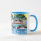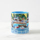 Uma caneca branca de boa qualidade, com jante azul em pó e alça e um design de colagem de papel pintado à mão de um pequeno porto com barcos de pesca e gaivotas. Consulte também cartão de saudação, presentes e roupa.