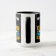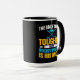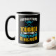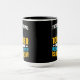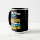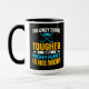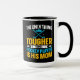 A caneca do tema do hóquei para a mãe com paus de hóquei e paus com texto de branco, amarelo e azul que lê A única coisa mais forte que um jogador de hóquei é sua mãe!