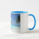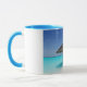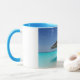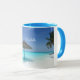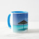 Uma caneca personalizada com uma fotografia de uma praia tropical cênica nas Maldivas. Uma praia branca arenosa e águas azuis cristais com um guarda-chuva compacto a solo. Secudido e sereno.