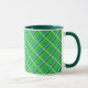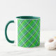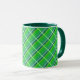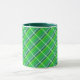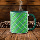 Uma caneca de café com um padrão xadrez verde fresco e elegante com pequenas listras brancas e azuis.