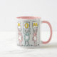 Caneca divertida para a mãe. Rabbit divertido, Design rosa e mug branco com ilustração de coelhos cor-de-rosa e azul. caneca de presente de dia de as mães. Coelhos bebês lindos. Os coelhos estão segurando cartas para soletrar a palavra MOM.