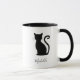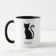 Uma caneca de café branca com um simples design com uma silhueta de gato preto e o seu nome sobre um fundo branco. A cor do plano de fundo pode ser alterada para qualquer cor desejada clicando no botão personalizar. Esta caneca de café personalizada faz um presente de excelente para um amante de gatos.