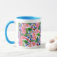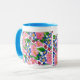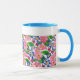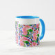 Uma caneca branca e de boa qualidade com jante azul e alça. O design floral pintado à mão é de primatas cor-de-rosa e azuis e o texto à volta do topo diz: "Uma caneca especial para uma mãe especial. Lavadora de louça e micro-ondas seguras. Veja também placas de saudação, presentes e roupa.