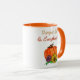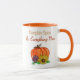 Uma bonita mão desenhada por abóbora, girassol e gráfico de mãe com o texto, "Pumpkin Spice and All Nice", caneca de café para o outono, outono e época das bruxas.