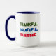 Juntem-se a esta charmosa caneca com uma abóbora, folhas, e as palavras "grato, grato, abençoado." Perfeito para o café da manhã ou cacau quente. Celebre a temporada de outono com esta caneca festiva. As cores quentes e a mensagem inspiradora vão iluminar o seu dia. Expresse a sua gratidão com cada passo. Esta caneca é uma bela adição a qualquer cozinha. Aproveite ao estilo as suas bebidas quentes favoritas. Esta caneca é funcional e decorativa com nome editável. Um presente perfeito para o amante do café ou do chá em sua vida. O design aconchegante e a mensagem positiva os fará sorrir.