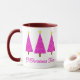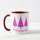 Mug em uma tomada moderna de um clássico motif de árvore de Natal - três árvores em orquídea e lavanda paisley, acentuadas com branco, sobre magenta com fundo violeta de ametista profundo, com o texto "O Natal
