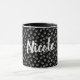 Pata de impressão com nome. Padrão de impressão de tela de cinza em fundo preto e nome personalizado branco. Personalize substituindo o nome de exemplo Nicole pelo seu próprio nome, nome personalizado ou texto de sua escolha. Incrível ideia personalizada de presente para uma mãe de gato, dono de cachorro ou qualquer outro amante de os animais de estimação.
