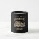 Ilustração retrorativa de gradação com texto "Deixe a aventura começar", pôr do sol, montanhas e decoração de pássaros para todos que gostam da natureza e caminhadas