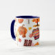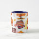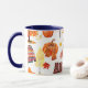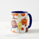 Fall/Autumn Mug - as cores são azul, laranja, amarela, marrom e branca. A xícara é uma montagem de outono de suéteres, folhas, abóboras, botas e árvores.