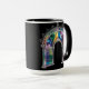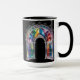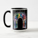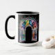 Brighten your daily routine with this Rainbow Stained Glass Arch Mug — a gothic cathedral window design rendered in vivid rainbow panes and delicate filigree against a deep black backdrop; perfect for lovers of stained-glass art, architectural motifs, and bold, colorful statement pieces, this ceramic coffee cup blends intricate detail with high-contrast drama to create a meaningful gift or collectible that celebrates light, color, and timeless design.