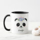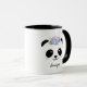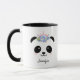 Uma linda rainha do panda personalizada. Bonito cara de panda kawaii chubby com bochechas cor-de-rosa vestindo uma coroa rosa e um arranjo de flores azuis. Adicione facilmente seu nome para personalizar a caneca. Você pode mudar a cor da caneca. Um belo presente para uma garota, uma filha, namorada de aniversário ou outra ocasião especial.