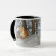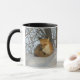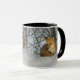 Maravilhoso close com a cena de inverno de neve coberta de colina e raposa descansante enquadrada com árvores.